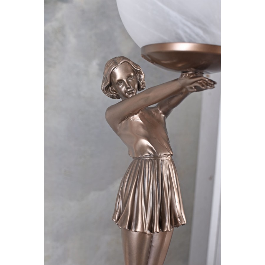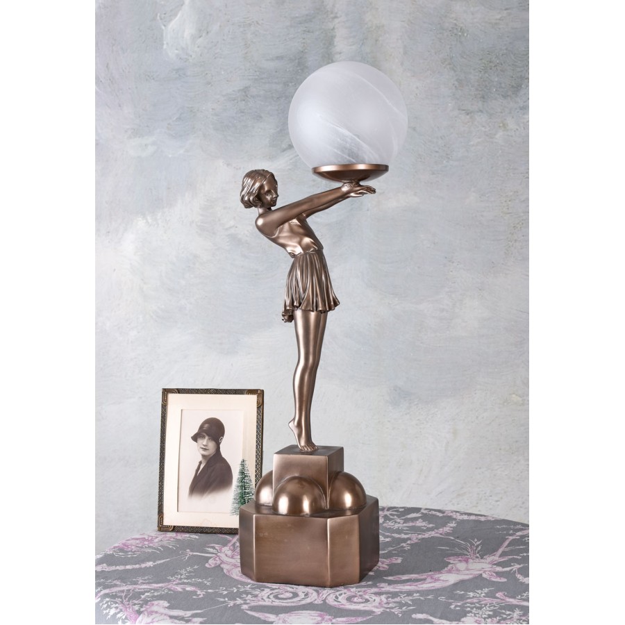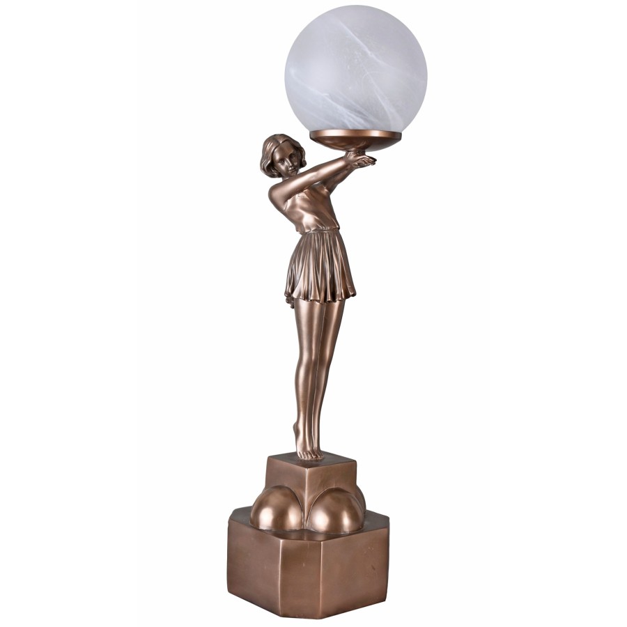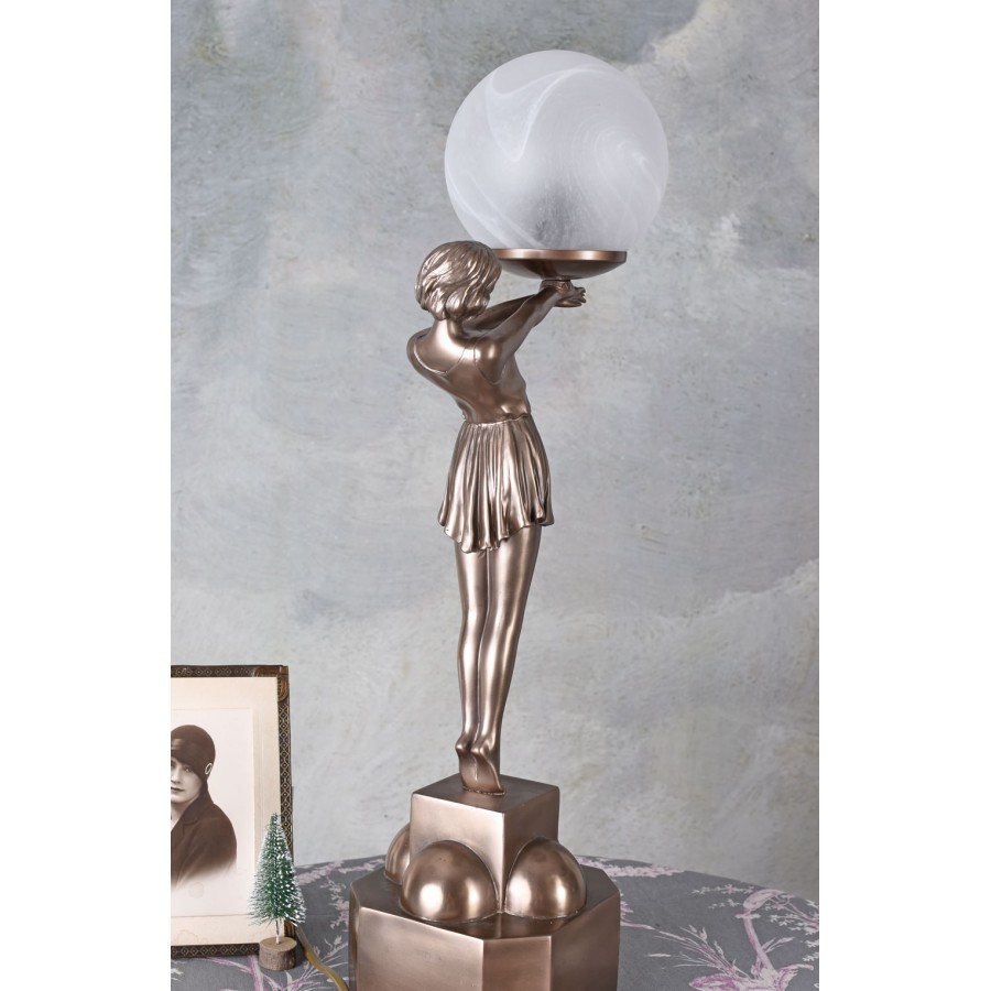 Jedinečné sochy jako tato ocenění nabízející tanečnice jsou zachyceny v pohybu, ve vysokém stylu Art Deco a zároveň působí nadčasovým dojmem. Inspirováno prací slavného francouzského umělce následuje figurální svítidlo starou tradici extra-dekorativního umění, kombinující eleganci a luxus. Téměř 40 cm vysoká osvětlená skulptura půvabně vyvažuje glóbus ze skla imitujícího mrazové mapy. Na robustním stupňovitém podstavci tato plachá umělkyně odhadluje své obnažené tělo propracovaná z vysoce kvalitní sochařské pryskyřice a ručně malované zlatem. Sběratelský kousek ve stylu bouřlivých 20.let poskytuje teplé světlo a šíří kolem sebe domáckou atmosféru.