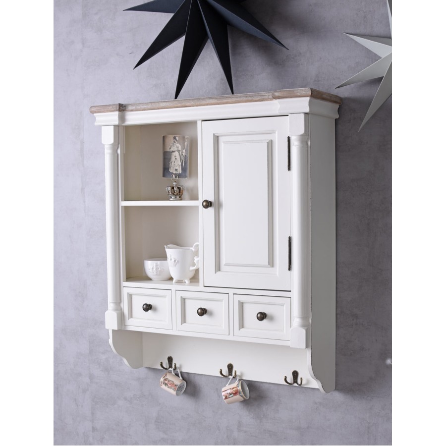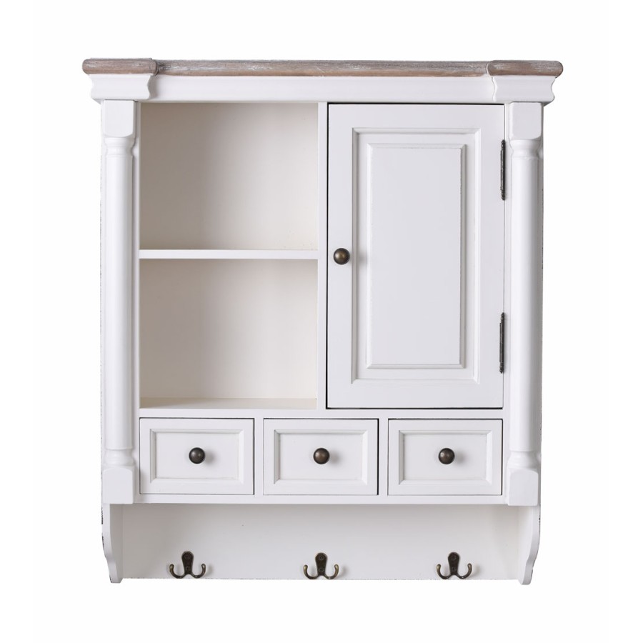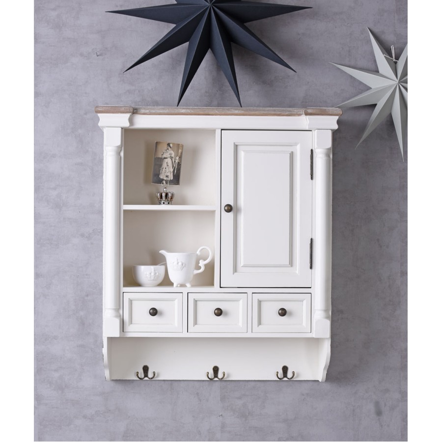 Rozměry: 75 x 65 x 20 cm, mosazné úchyty a háčky, 3 šuplíky, lakováno v bílé antik