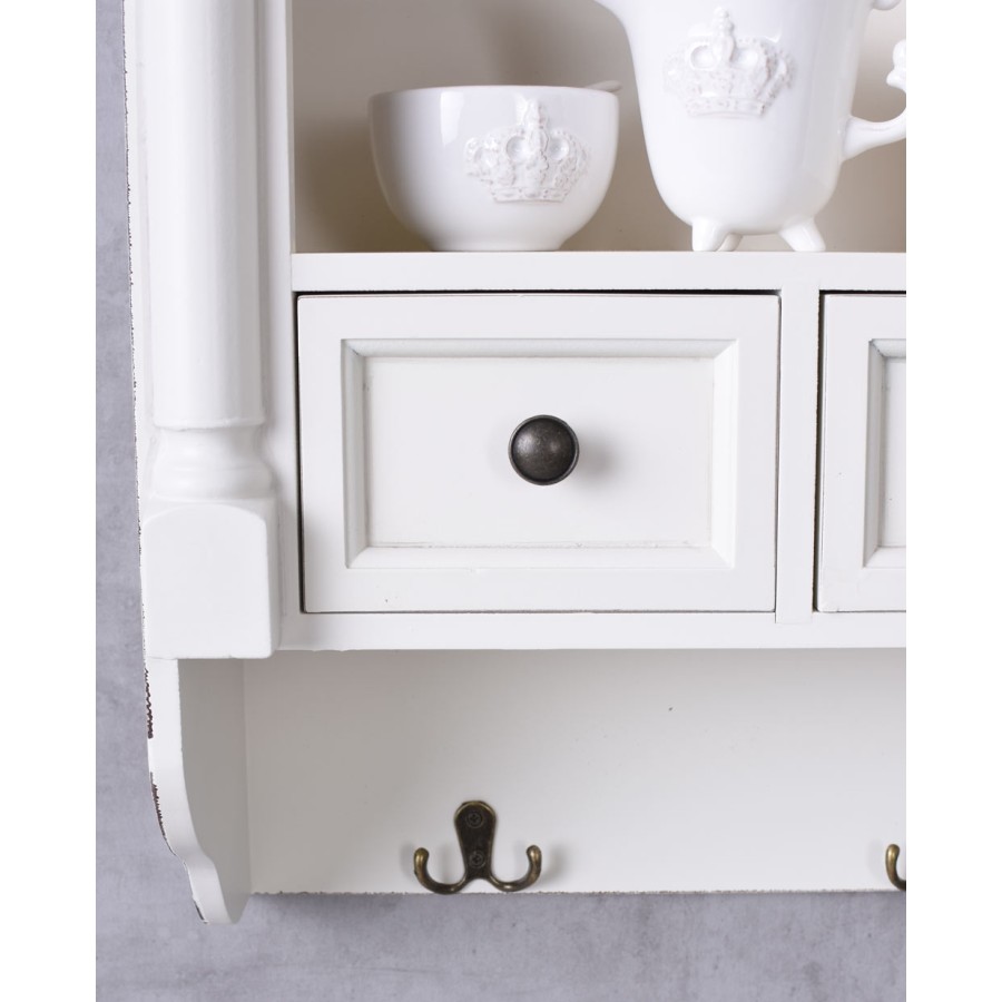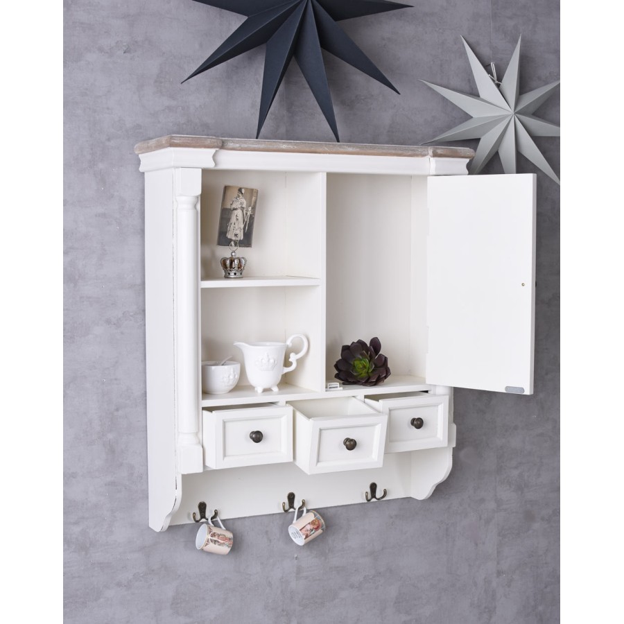 Kdo by si rád neužíval romantického venkovského vzdoušku středomořského pobřeží Francie, provoněného sušenou levandulí a tymiánem. Nezbytnou součástí plážových domků jsou dřevěné okenice, které jsou využívány proti slunečnímu svitu, ale mají i své estetické stránky. Jejich nezaměnitelný design je proto častou součástí i interiérového nábytku, stejně jako se tomu stalo u naší nástěnné konzole se třemi šuplíky a třemi kovovými věšáčky. Tento romantický kus nábytku s téměř neomezeným využitím je vyroben z masivního dřeva a je přímo ideální jako praktická kuchyňská police, elegantní skříňka do koupelny nebo úložná skříň v předsíni.